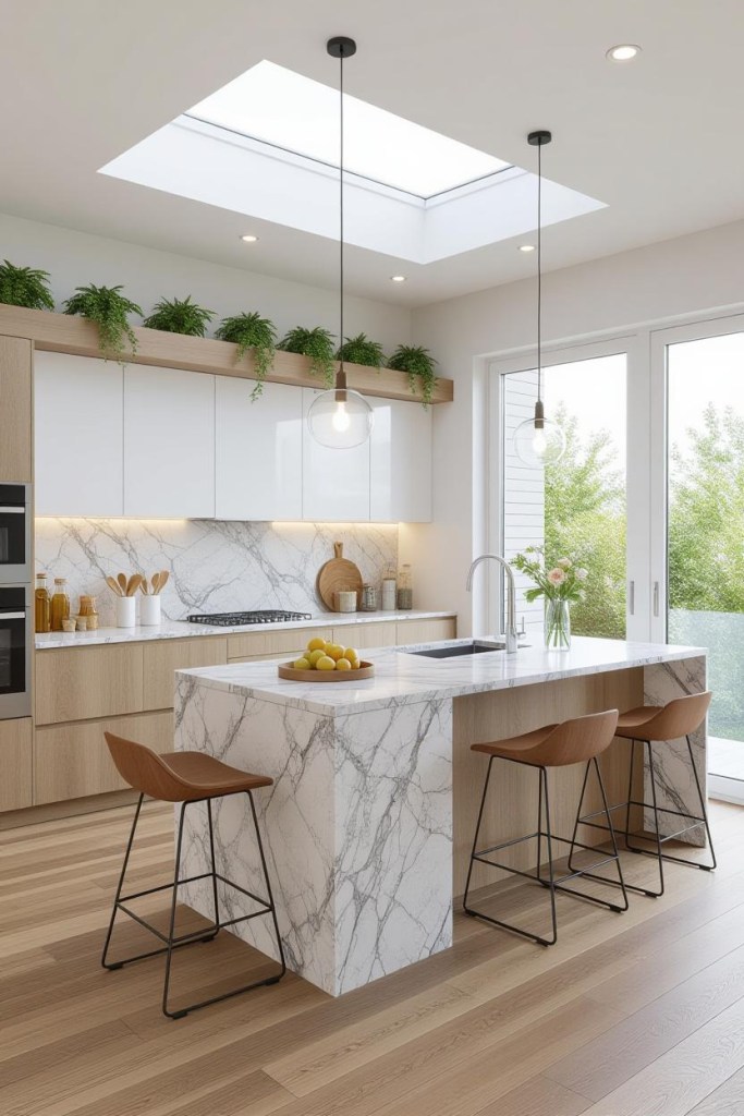 - Luxury Finishes: Introduced a marble waterfall island and warm wood cabinetry.