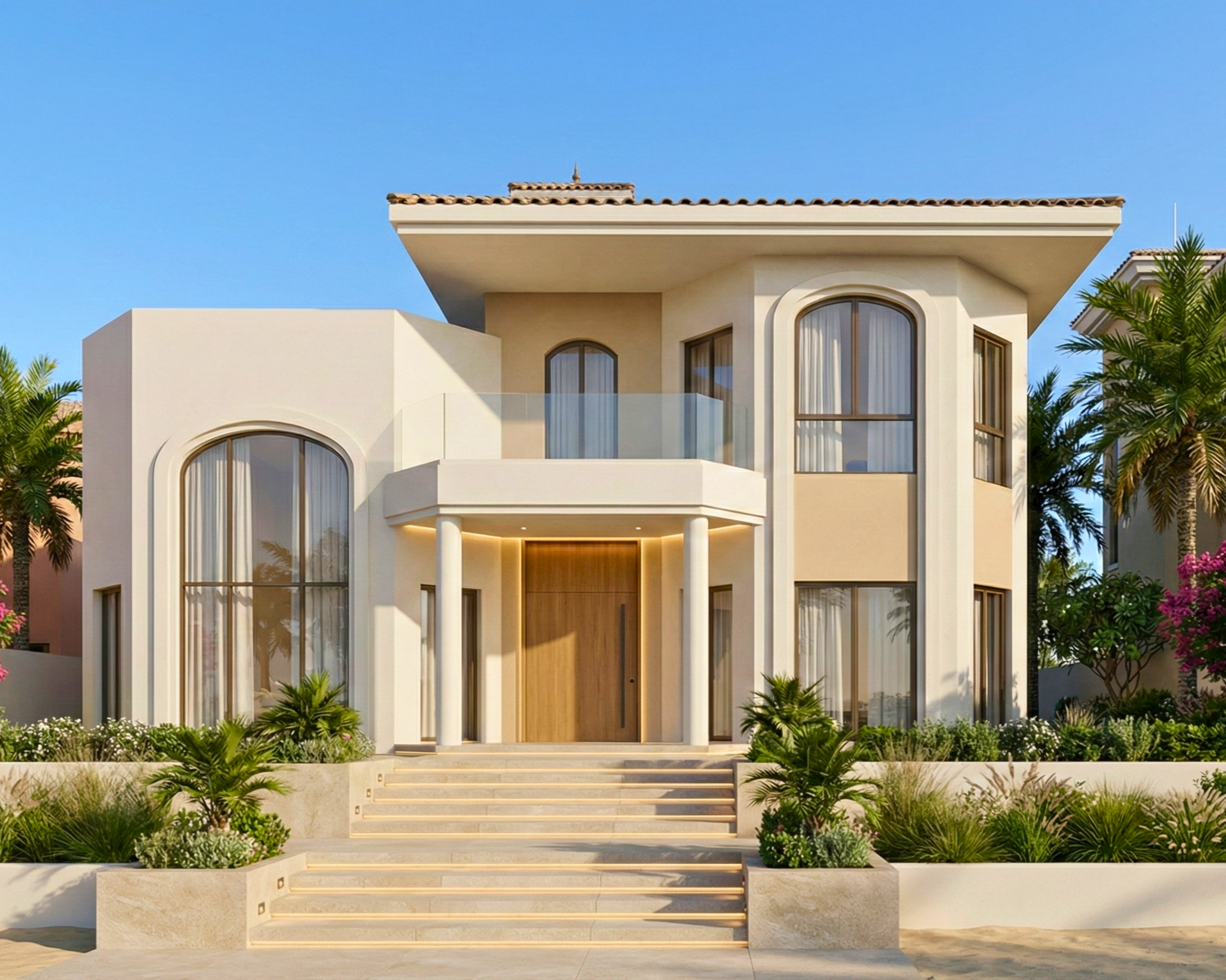 - The Facade Swap: We replaced the dated Ochre/Yellow stucco with a Crisp White Plaster. In the intense Dubai heat, this instantly signals “Cool, Clean, and Modern”.