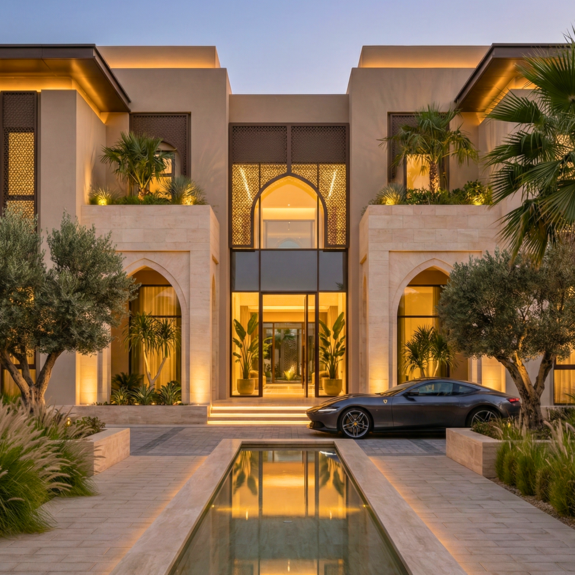 First impressions are everything. The modern GCC facade demands a commanding presence, achieved through perfect symmetry and the play of light. Notice how the modern interpretation of the Mashrabiya (screens) provides privacy while creating a lantern-like effect at night. The central water feature isn’t just decoration; it’s an ancient architectural device to cool the air and calm the mind before entering.