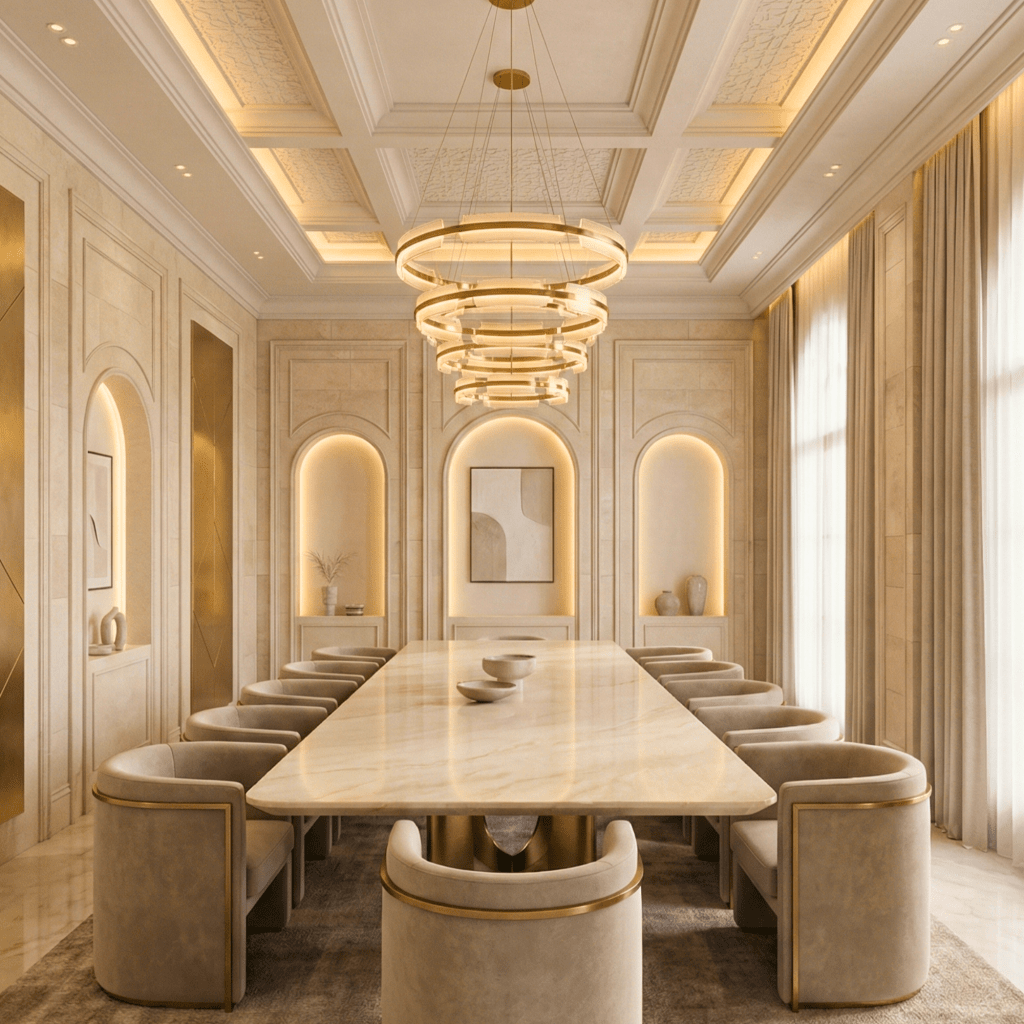 A luxury villa must be ready to host. This dining hall balances monumental scale with intimate detailing. The layered chandelier acts as a crown jewel, drawing the eye down to the marble table. The use of arches here serves to frame the space, adding depth and a sense of rhythm to the room.