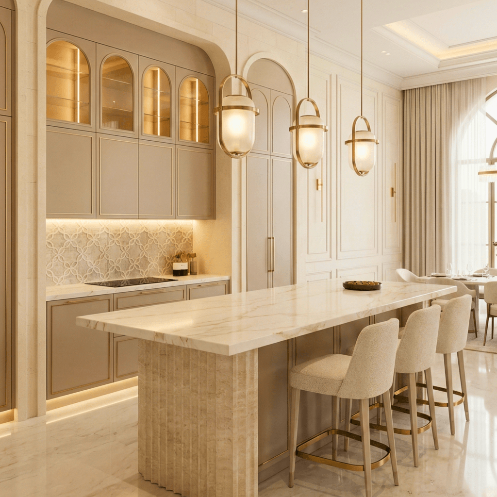 The kitchen has transitioned from a purely service area to a showpiece. The blend of beige stone, gold hardware, and integrated lighting turns functional cabinetry into architectural joinery. It is designed to be seen, admired, and used.