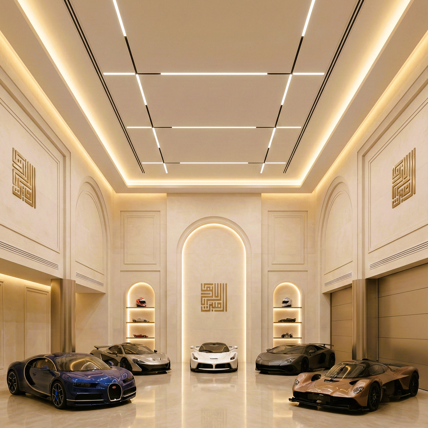For the Ultra-High Net Worth individual, cars are not transport; they are art. This space breaks the mold of a traditional “garage.” With gallery-style lighting, high-gloss flooring, and architectural niches for memorabilia, this is a sanctuary for the automotive collector. It elevates the vehicles (like the Bugatti and Ferrari shown here) into the masterpieces they are.