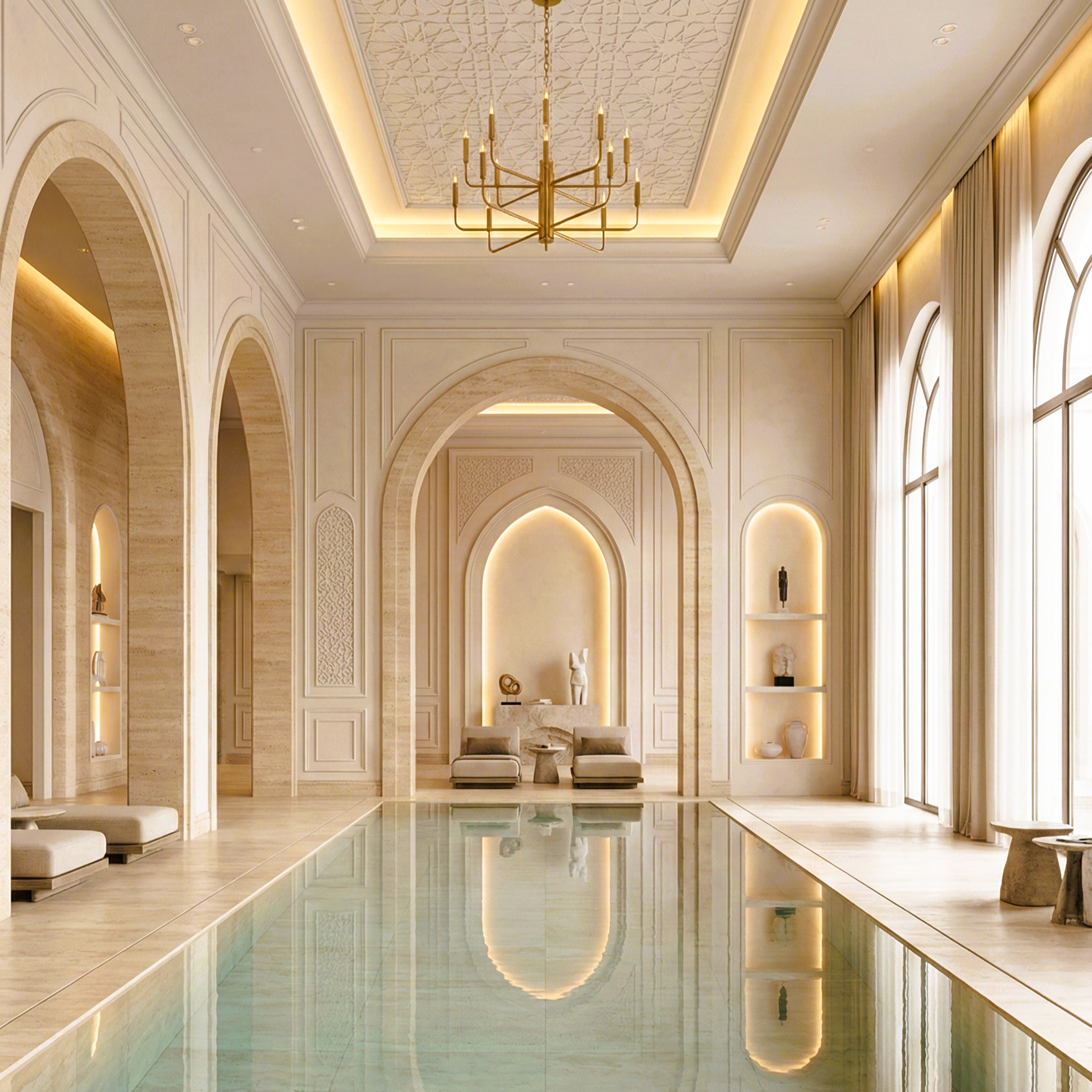 Privacy is paramount. This indoor pool acts as a private sanctuary, shielded from the outside world but bathed in light. The rhythm of the stone arches reflects beautifully on the water, creating a spa-like experience that rivals the finest hotels in Dubai or Riyadh.
