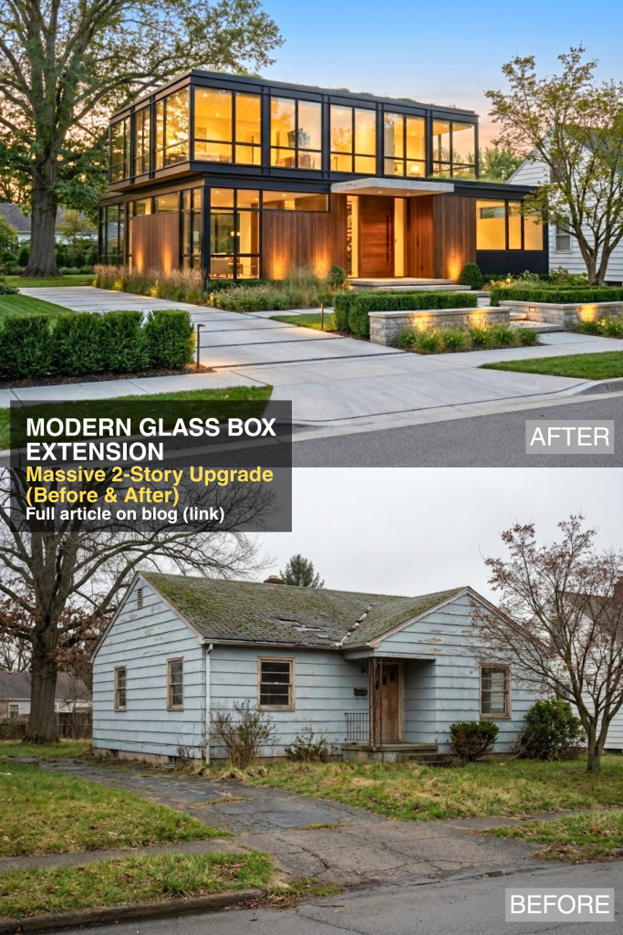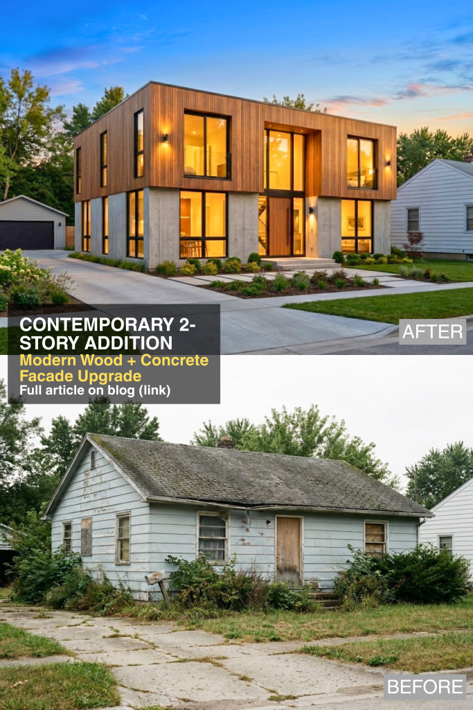 The Vibe: Geometric harmony. The Strategy: This design plays with volumes. The heavy concrete base supports a lighter, wood-clad box on top. It’s a “Stacked” aesthetic that makes the home feel solid and substantial. The vertical windows emphasize the new height of the home. Best For: Urban lots where you want to maximize internal square footage without sacrificing style.