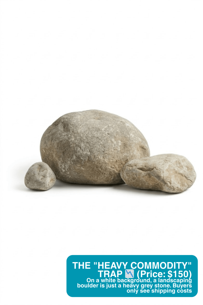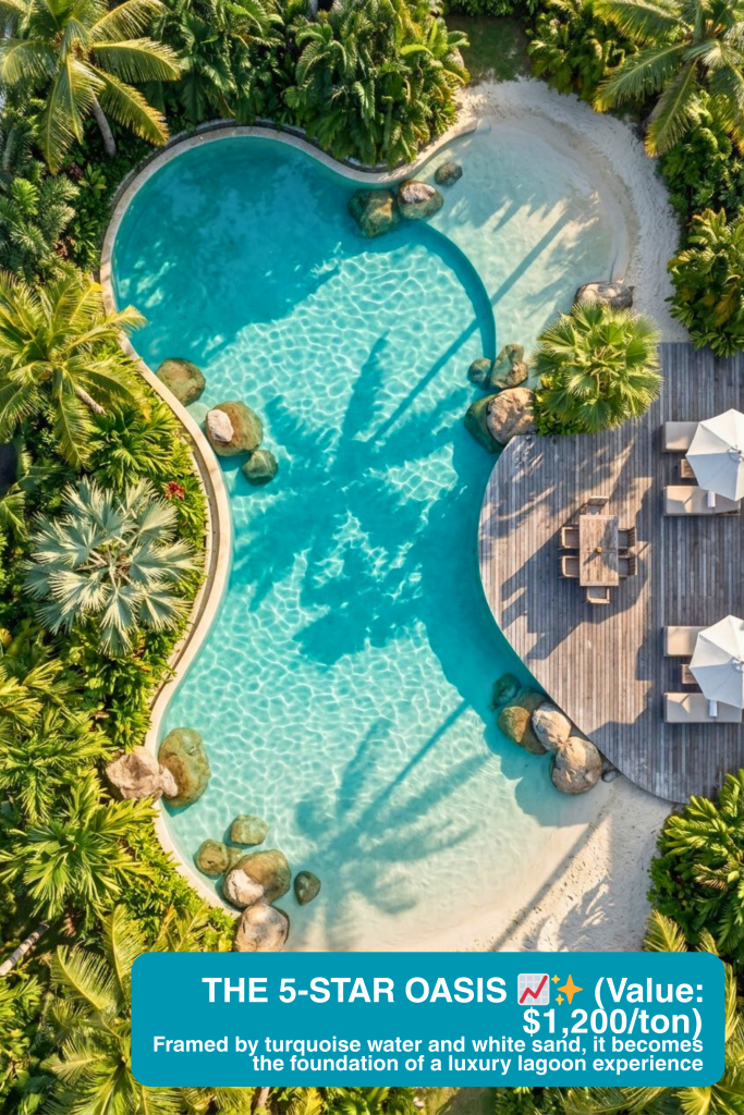 Isolated on white, a landscaping boulder is just a heavy grey stone. Buyers only see shipping logistics and manual labor. But when we integrate those same rocks into a photorealistic, bird’s-eye lagoon pool with white sand and turquoise water, they become the essential foundation of a luxury experience. You are no longer selling a $150 rock; you are selling a $1,200/ton private island aesthetic.