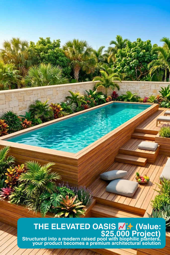 Selling a single composite plank on a plain background makes premium cladding look like cheap hardware-store lumber. Swipe that same material into our 3D software, and we engineer it into an elegant, modern raised pool with integrated biophilic planters. Suddenly, the buyer isn’t looking at a $25 board; they are investing in a $25,000 modern backyard transformation.