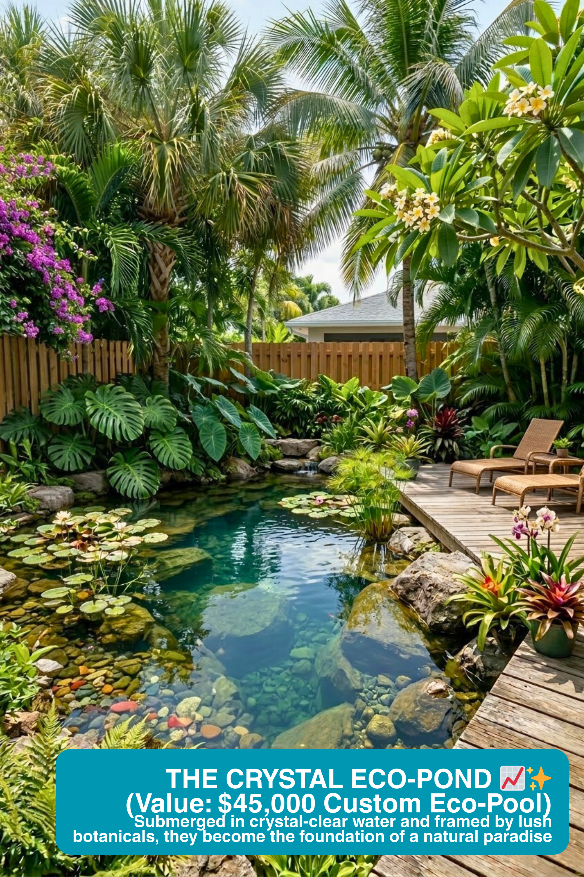 When selling materials for Natural Swimming Pools (Eco-Pools), dry river rocks on a white page look exactly like cheap driveway gravel. By submerging those stones in crystal-clear water alongside lush botanicals like water lilies, we eliminate the fear of a “swampy” pool. It transforms basic pebbles into the foundation of a $45,000 chemical-free retreat.