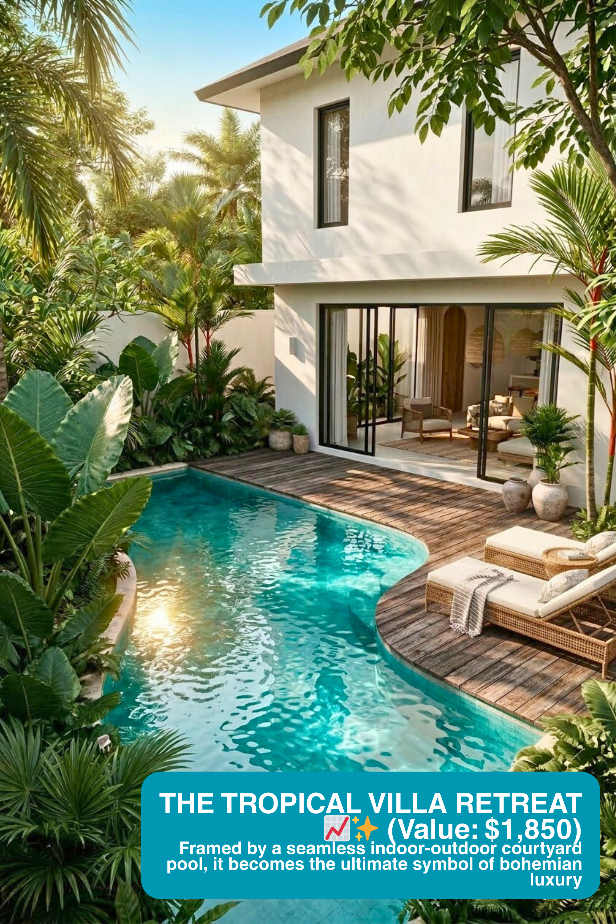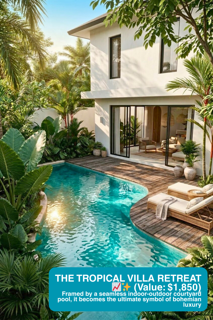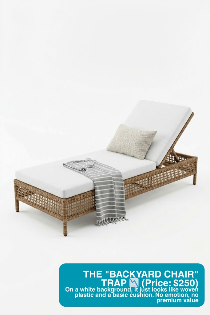Woven or rattan furniture loses its soul in a sterile studio. It looks like discount backyard seating. We justify premium pricing by placing your loungers in an intimate, seamless indoor-outdoor courtyard pool setting. Framed by tropical architecture, your product isn’t just a patio chair; it’s a ticket to a luxury villa lifestyle in Bali.