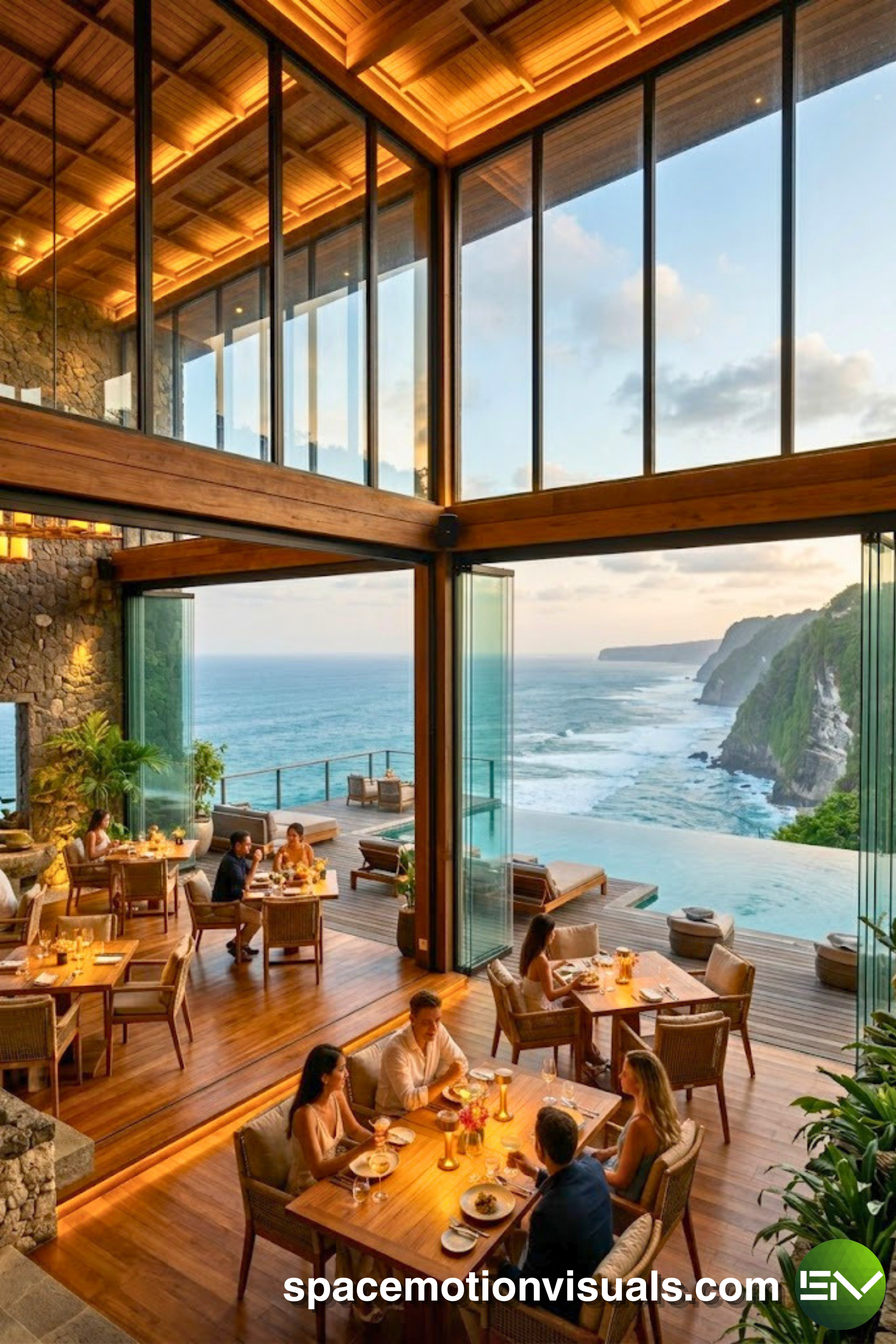 The Vibe: Dramatic, daring, and unapologetically elite. The Investment Case: For ocean-facing or volcano-edge lots, this is the ultimate play. A sleek, minimalist glass structure cantilevered over the drop-off. ROI Driver: Exclusivity. You are not just selling food; you are selling a once-in-a-lifetime “edge of the world” experience. This concept allows for pre-booking, required deposit dining, and significant high-ticket private event revenue.