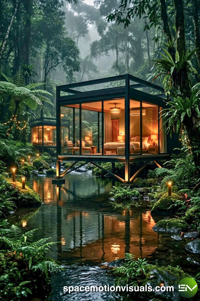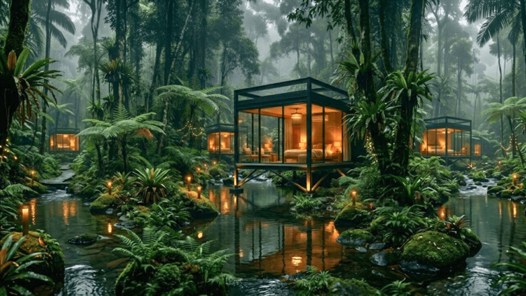 The Vibe: Modern, intimate, and perfectly framed. The Investment Case: The ultimate “Glamping” upgrade. A modern A-frame glass cabin nestled in dense foliage. It provides the “camping in the wild” feeling with 5-star comfort and air conditioning. ROI Driver: High Viral Potential. These “tiny home in the jungle” concepts are highly sought after by travel influencers, creating free organic marketing loops that keep occupancy rates high.